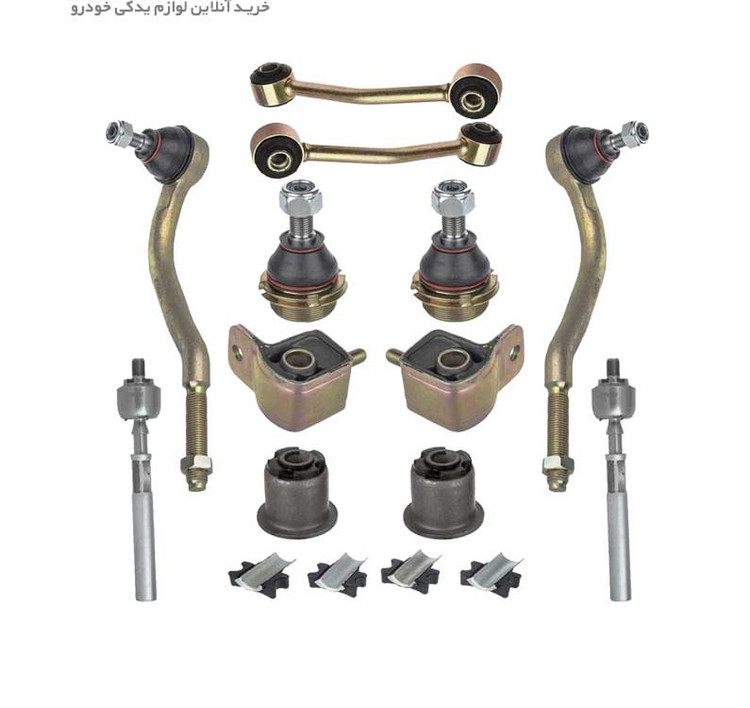 ویژگی: قطعات جلوبندی رفیع نیا کاملا نو و با تضمین اصالت کالا حاوی دو عدد سیبک دو عدد زیر کمک 2عدد میل موج گیر 2 عددجناقی ولبه دار 2عدد لاستیک چاکدار