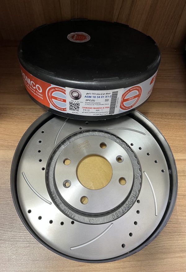 دیسک چرخ جلو سوراخ دار سمند دنا از سوی شرکت آسمکو تولید شده است. این شرکت، یک شرکت ایرانی معتبر در زمینه تولید دیسک ترمز و سایر لوازم جانبی خودروها است که از بهترین متریال ها و فلزات برای ساخت این دیسک ها استفاده می کند.